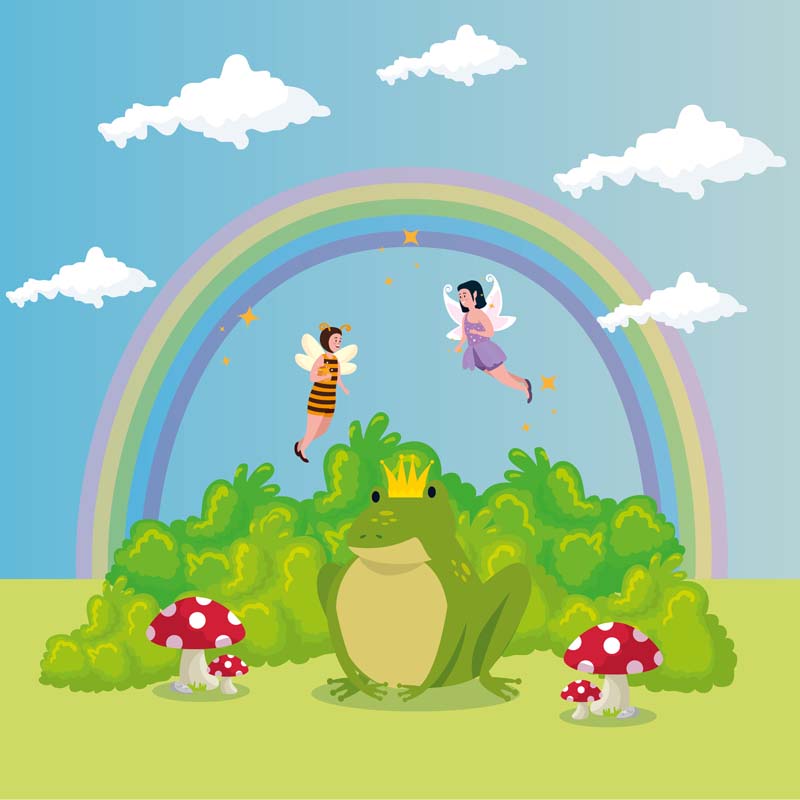 Sob o arco colorido do arco-íris, um reino mágico ganha vida. Uma pequena abelha e uma delicada fada voam suavemente sobre o jardim encantado, enquanto um simpático sapo coroado descansa entre flores e cogumelos. A cena nos lembra que, no universo infantil, tudo é possível — até mesmo reinos secretos podem existir atrás de um simples arbusto.