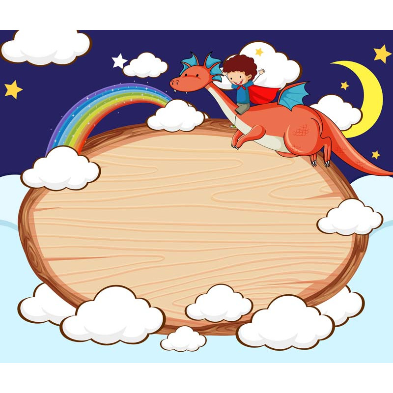 Entre nuvens macias e estrelas brilhantes, uma criança corajosa atravessa o céu montada em um dragão amigo, passando pelo arco-íris como quem atravessa a ponte para um mundo mágico. A grande placa de madeira ao centro parece um convite aberto: aqui cabem histórias, aventuras e sonhos sem limites.